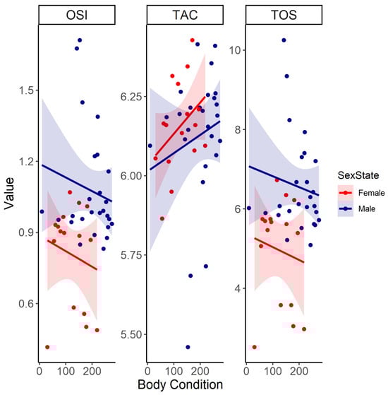 The linear relationships between body condition (body condition—residuals of size/mass regression) and oxidative variables, namely oxidative stress index (OSI), total antioxidant capacity (TAC), and total oxidant status (TOS) between female and male Cape ground squirrels (Xerus inauris). Red values for females and dark blue values for males. The line represents a generalized linear model regression with a Gaussian family and identity link as a representation for the statistical outputs. The shaded areas around the smoothed line represent the 95% confidence intervals, indicating the range in which the true smoothed values are likely to fall with 95% confidence.
