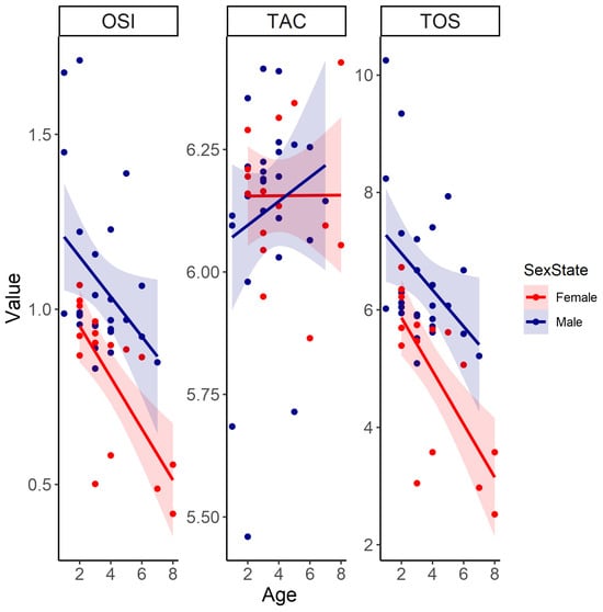 The linear relationships between age (years) and oxidative variables, namely oxidative stress index (OSI), total antioxidant capacity (TAC), and total oxidant status (TOS) between female and male Cape ground squirrels (Xerus inauris). Red values for females and dark blue values for males. The line represents a generalized linear model regression with a Gaussian family and identity link as a representation for the statistical outputs. The shaded areas around the smoothed line represent the 95% confidence intervals, indicating the range in which the true smoothed values are likely to fall with 95% confidence.