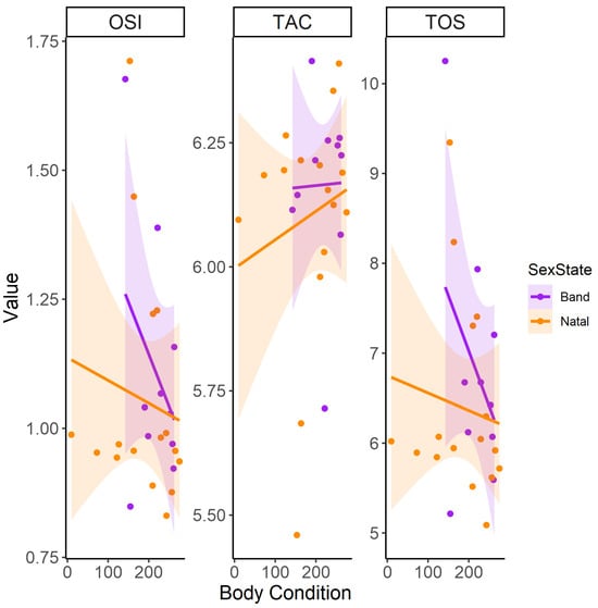 The linear relationship between body condition (body condition—residuals of size/mass regression) and oxidative variables, namely oxidative stress index (OSI), total antioxidant capacity (TAC), and total oxidant status (TOS), between band and natal Cape ground squirrel (Xerus inauris) males. Purple values for band males and orange values for natal males. Each line represents a generalized linear model regression with a Gaussian family and identity link as a representation of the statistical outputs. The shaded areas around the smoothed line represent the 95% confidence intervals, indicating the range in which the true smoothed values are likely to fall with 95% confidence.