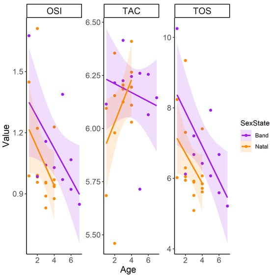 The linear relationship between age (years) and oxidative variables, namely oxidative stress index (OSI), total antioxidant capacity (TAC), and total oxidant status (TOS), between band and natal Cape ground squirrel (Xerus inauris) males. Purple values for the band and orange values for natal males. Each line represents a generalized linear model regression with a Gaussian family and identity link as a representation of the statistical outputs. The shaded areas around the smoothed line represent the 95% confidence intervals, indicating the range in which the true smoothed values are likely to fall with 95% confidence.