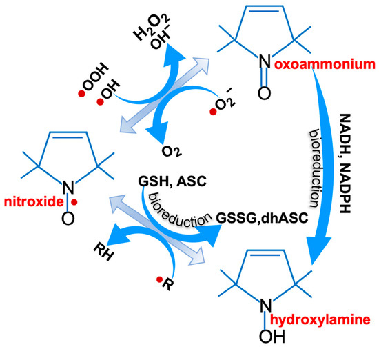 - Samuni, A.; Goldstein, S.; Russo, A.; Mitchell, J.B.; Krishna, M.C.; Neta, P. Kinetics and mechanism of hydroxyl radical and OH-adduct radical reactions with nitroxides and with their hydroxylamines. J. Am. Chem. Soc. 2002, 124, 8719–8724. [Google Scholar] [CrossRef]