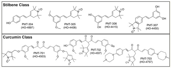 The ability of the PALs to reduce the oxidation of DCFH with hydroxyl radical (•OH) generation is shown in Figure 7B. Nitroxides react poorly with •OH, but can oxidize them to an oxoammonium state [74]. However, •OH reacts with both curcumin and stilbenes, and so most direct scavenging is likely elicited from the scaffold portion of the PAL. As a group, the stilbene PALs do not reduce DCFH oxidation by •OH when reduced glutathione (GSH) is omitted. The GSH dependence of the stilbene polyphenols has been previously described: in the absence of GSH, polyphenolic stilbenes enhance the Cu(II)-catalyzed production of •OH [75]. This phenomenon is consistent with the fact that PMT-306 and -307 increase DCFH oxidation relative to the control in the absence of GSH. However, in the presence of reducing agents such as ascorbate or GSH, phenolic stilbenes switch to displaying antioxidant activity in the presence of •OH radicals generated by the Fenton reaction [75]. The rapid conversion of •OH into thiyl radical GS• can be effectively scavenged by both stilbenes [75] and nitroxides [76]. Indeed, in the presence of GSH, the antioxidant activity of each stilbene PAL is observed (Figure 7B). Thus, in the cellular environment of millimolar GSH, each of the stilbene PALs is expected to reduce the oxidative damage elicited by •OH. In contrast, each of the curcumin PALs, at 8 μM, strongly reduces DCFH oxidation, independently of GSH. This is consistent with curcumin’s established capacity to scavenge •OH directly [77].