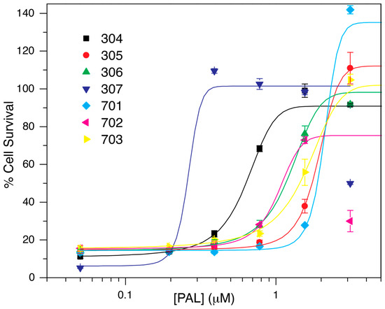 MC65 cells are neuronal cells derived from a human neuroblastoma line developed to accumulate intracellular Aβ [37,38,39,40]. This is achieved via the conditional expression of the carboxyl-terminal 99 residues of the amyloid-β precursor protein (APP-C99) that is suppressed by tetracycline (TC) in the culture medium (TC+). The removal of TC from cell the culture medium (TC−) induces the expression of APP-C99, which is then cleaved by the cellular γ and β secretases to generate Aβ. Intracellular Aβ is known to start to accumulate as early as 4 h after TC removal, with maximal levels reached at 24 h. Cell death relative to the TC+ control is measured 3 days after the removal of TC, with the increased death correlated with the intracellular accumulation of AβOs rather than the small amounts of secreted Aβ [40]. Cell survival was determined using an MTT assay [40]. Cells were treated with either DMSO or the indicated concentration of PAL at the same time as TC removal, with a uniform level of DMSO (0.05%) used in all assay cultures. Cell survival is expressed as the mean percentage viability of 3 × 104 cells/well counted from n = 3 cultures, with parallel TC+ cultures of equal numbers of cells set at 100% viability. To determine the PAL concentration needed to achieve 50% protection, data were plotted in the Origin graphing and analysis software version 9 (OriginLab Corp, Northampton, MA, USA) using the logistic dose–response function. R2 values ranged from 0.982 to 0.999.