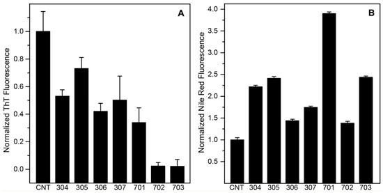 We also screened for compounds that alter oligomer structure and/or assembly according to fluorescent dye intensity, which is sensitive to beta-sheet accumulation and accessible hydrophobic surface area [59]. The fluorescent ThT dye is sensitive for the progressive increase in β-sheet content occuring with Aβ fibril assembly [60,61]. The increase in β-sheet content is therefore indicative of Aβ fibril assembly and its conformational convertion. We measured the effects of PALs on ThT fluorescence in the presence of Aβ over 24 h of incubation. As shown in Figure 5A, all of the PALs reduced the ThT intensity relative to control. This suggests that PAL binding to Aβ inhibits β-sheet formation. However, the CD results demonstrate that PALs 305, 307 and 702 induce β-sheet structures in early Aβ oligomers; thus, competition for ThT binding within β-pleated regions of AβOs must be considered for these compounds (vs. allosteric effects that reduce β-sheet formation).