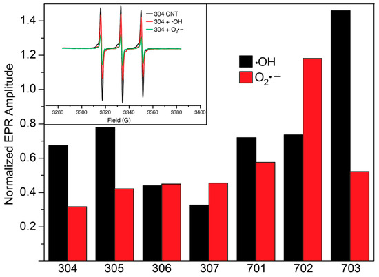 The involvement of the nitroxyl moiety in the peroxidase and Fenton ROS measurements was probed by EPR for both reaction conditions (Figure 8). In these measurements, the loss of paramagnetism demonstrates the participation of the nitroxyl moiety in the redox chemistry, with conversion into either the reduced hydroxylamine or the oxidized oxoammonium resulting in a diamagnetic species with no EPR signal (see above). With the exception PMT-702, all the candidates show nitroxide redox activity in the presence of O2•− production (Figure 8). In the case of PMT-702, the net increase in the signal with O2•− suggests that the reductive capacity of the curcumin moiety maintains an equilibrium of nitroxide and its hydroxylamine, which is then shifted towards nitroxyl upon reaction with O2•−.