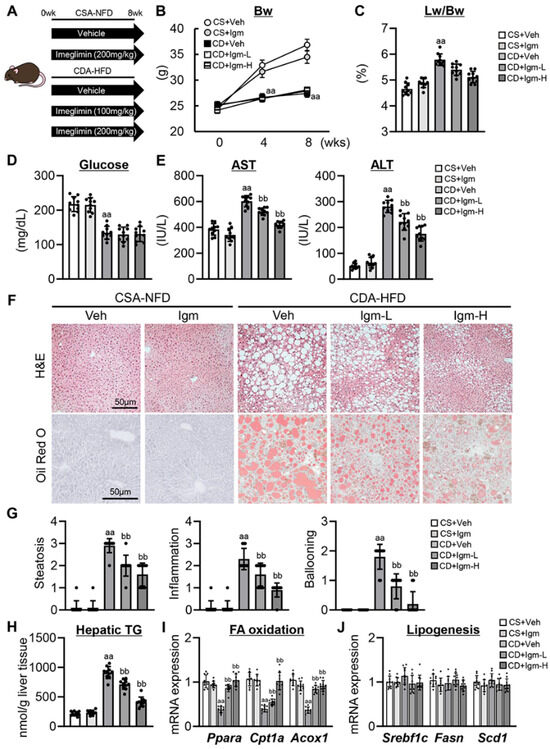 Effect of imeglimin on hepatic steatosis in CDA-HFD-fed mice. (A) Mice experimental design. (B) Changes in the body weight (Bw) during the experimental period. aa: p < 0.01 vs. CS+Veh group, significant difference between groups by Student’s t-test. (C) Liver/body weight (Lw/Bw) at the end of experiment. aa: p < 0.01 vs. CS+Veh group, significant difference between groups by Student’s t-test. (D) Serum glucose level. aa: p < 0.01 vs. CS+Veh group, significant difference between groups by Student’s t-test. (E) Serum aspartate aminotransferase (AST), alanine aminotransferase (ALT) levels. aa: p < 0.01 vs. CS+Veh group, bb: p < 0.01 vs. CD+Veh group, significant difference between groups by Student’s t-test. (F) Representative microphotographs of liver section stained with hematoxylin and eosin (H&E) and Oil Red O. (G) Hepatic pathological scores for steatosis, inflammation and ballooning at a 400-fold magnification. aa: p < 0.01 vs. CS+Veh group, bb: p < 0.01 vs. CD+Veh group, significant difference between groups by Student’s t-test. (H) Hepatic triglyceride (TG) content. aa: p < 0.01 vs. CS+Veh group, bb: p < 0.01 vs. CD+Veh group, significant difference between groups by Student’s t-test. (I,J) Hepatic mRNA level of the markers related to (I) fatty acid (FA) oxidation and (J) lipogenesis. aa: p < 0.01 vs. CS+Veh group, bb: p < 0.01 vs. CD+Veh group, significant difference between groups by Student’s t-test. Gapdh was used as an internal control for qRT-PCR. Quantitative values are indicated as fold changes to the values of CS+Veh group. Data are the mean ± SD (n = 10; (B–E,G–J)). CS, CSA-NFD-fed mice; CD, CDA-HFD-fed mice; Veh, vehicle-treated group; Igm-L, imeglimin (100 mg/kg)-treated group; Igm-H, imeglimin (200 mg/kg)-treated group.