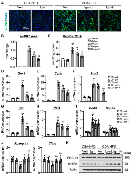 Effect of imeglimin on intracellular stress and mitochondrial biogenesis in CDA-HFD-fed mice. (A) Representative microphotographs of liver section immunofluorescent stained with 4-hydroxynonenal (HNE). (B) Quantitation of 4-HNE+ area in high-power field (HPF). aa: p < 0.01 vs. CS+Veh group, bb: p < 0.01 vs. CD+Veh group, significant difference between groups by Student’s t-test. (C) Hepatic malondialdehyde (MDA) content. aa: p < 0.01 vs. CS+Veh group, bb: p < 0.01 vs. CD+Veh group, significant difference between groups by Student’s t-test. (D–H) Hepatic mRNA level of five antioxidant enzyme genes, (D) Gpx1, (E) Cybb, (F) Sod2, (G) Cat and (H) Ncf4. aa: p < 0.01 vs. CS+Veh group, bb: p < 0.01 vs. CD+Veh group, significant difference between groups by Student’s t-test. (I) Hepatic mRNA level of ER stress-related markers. aa: p < 0.01 vs. CS+Veh group, significant difference between groups by Student’s t-test. (J) Hepatic mRNA level of mitochondrial biogenesis markers. aa: p < 0.01 vs. CS+Veh group, bb: p < 0.01 vs. CD+Veh group, significant difference between groups by Student’s t-test. (K) Western blotting for mitochondrial biogenesis markers. Gapdh and Actin were used as an internal control for qRT-PCR and western blotting, respectively. Quantitative values are indicated as fold changes to the values of CD+Veh (B) or CS+Veh group (D–J). Data are the mean ± SD (n = 10; (B–J)). CS, CSA-NFD-fed mice; CD, CDA-HFD-fed mice; Veh, vehicle-treated group; Igm-L, imeglimin (100 mg/kg)-treated group; Igm-H, imeglimin (200 mg/kg)-treated group.