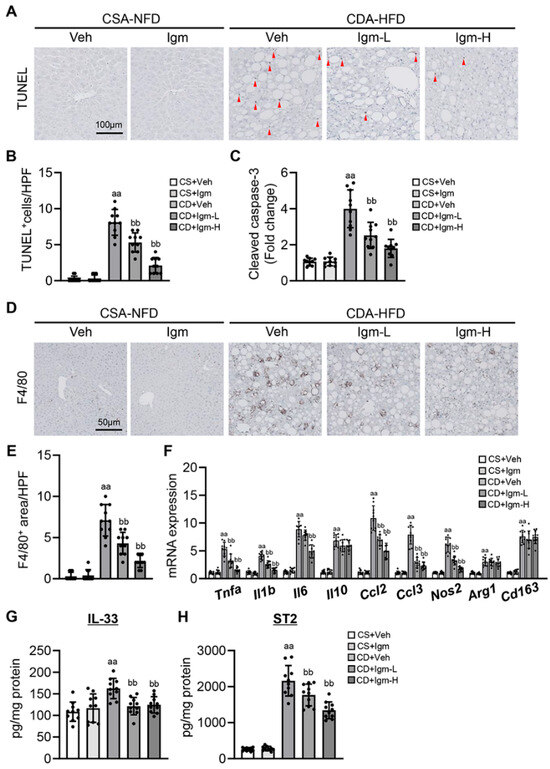 In CDA-HFD-fed mice, TUNEL-positive apoptotic hepatocytes were markedly increased with ROS accumulation (Figure 3A,B). Hepatocyte apoptosis in CDA-HFD mice was also indicated by elevated cleaved caspase-3 levels in the liver tissue (Figure 3C), but they were significantly suppressed after imeglimin treatment (Figure 3A–C). Subsequently, we evaluated the effect of imeglimin on the inflammatory status in the liver of CDA-HFD-fed mice. Treatment with imeglimin reduced the hepatic infiltration of F4/80-positive macrophages, which were extensively observed in CDA-HFD-fed mice (Figure 3D,E). CDA-HFD-fed mice showed increased hepatic mRNA levels of both markers related to M1 (Tnfa, Il1b, Il6, Ccl2, Ccl3, and Nos2) and M2 macrophages (Il10, Arg1, and Cd163) (Figure 3F). Notably, imeglimin suppressed marker expression mainly in M1 macrophages, whereas it had almost no effect on M2 macrophage markers (Figure 3F). In a recent study, mitochondrial DNA released from injured hepatocytes under lipotoxicity induced the upregulation of IL-33 expression in macrophages and enhanced lipopolysaccharide (LPS)-induced inflammatory cytokine production [25]. Imeglimin significantly reduced the hepatic levels of IL-33 and its receptor, ST2, in CDA-HFD-fed mice (Figure 3G,H).
