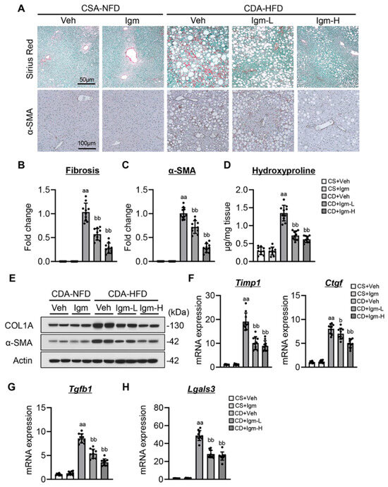 Effect of imeglimin on hepatic fibrosis in CDA-HFD-fed mice. (A) Representative microphotographs of liver section stained with Sirius red and α-smooth muscle actin (SMA). (B,C) Quantification of (B) Sirius red stained fibrotic area and (C) α-SMA-positive area in high-power field (HPF). aa: p < 0.01 vs. CS+Veh group, bb: p < 0.01 vs. CD+Veh group, significant difference between groups by Student’s t-test. (D) Hepatic content of hydroxyproline. aa: p < 0.01 vs. CS+Veh group, bb: p < 0.01 vs. CD+Veh group, significant difference between groups by Student’s t-test. (E) Western blotting for protein expression of COL1A and α-SMA. (F–H) Hepatic mRNA level of (F) Timp1 and Ctgf, (G) Tgfb1, and (H) Lgals3. aa: p < 0.01 vs. CS+Veh group, b,bb: p < 0.05, 0.01 vs. CD+Veh group, significant difference between groups by Student’s t-test. Gapdh and Actin were used as an internal control for qRT-PCR and western blotting, respectively. Quantitative values are indicated as fold changes to the values of CD+Veh (B,C) or CS+Veh (F–H). Data are the mean ± SD (n = 10; (B–D,F–H)). CS, CSA-NFD-fed mice; CD, CDA-HFD-fed mice; Veh, vehicle-treated group; Igm-L, imeglimin (100 mg/kg)-treated group; Igm-H, imeglimin (200 mg/kg)-treated group.