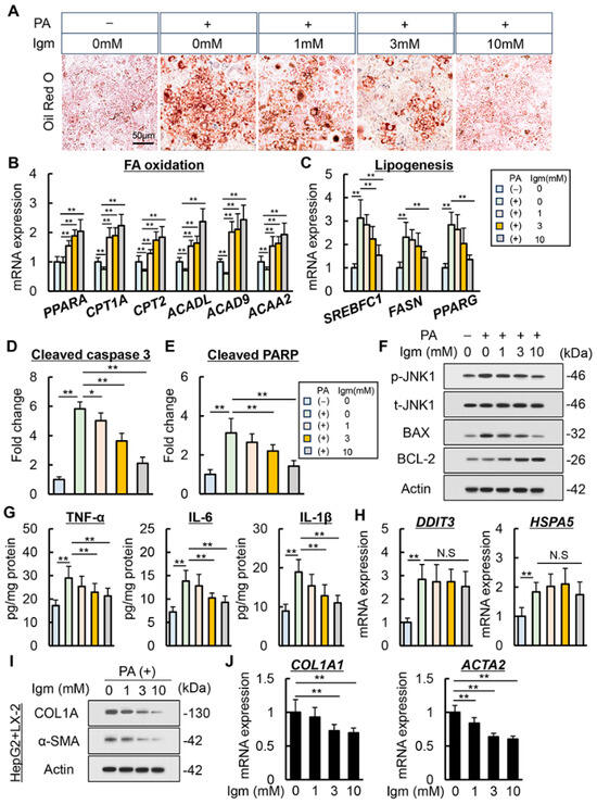 Effect of imeglimin on palmitic acid-stimulated lipid accumulation and apoptosis in human hepatocyte. (A) Representative microphotographs of palmitic acid (PA)-stimulated HepG2 stained with Oil Red O. (B,C) Intracellular mRNA expression of (B) fatty acid (FA) oxidation-related genes and (C) lipogenesis-related genes in PA-stimulated HepG2. **: p < 0.01, significant difference between groups by Student’s t-test. (D,E) Intracellular level of (D) cleaved caspase-3 and (E) cleaved PARP in PA-stimulated HepG2. *: p < 0.05, **: p < 0.01, significant difference between groups by Student’s t-test. (F) Western blotting for phospho-JNK (p-JNK), total JNK (t-JNK), BAX and BCL-2 expression in PA-stimulated HepG2. (G) Intracellular level of TNF-α, IL-6 and IL-1β in PA-stimulated HepG2. **: p < 0.01, significant difference between groups by Student’s t-test. (H) Intracellular mRNA expression of ER stress-related genes in PA-stimulated HepG2. **: p < 0.01, significant difference between groups by Student’s t-test. (I,J) Intracellular (I) protein and (J) mRNA expression of profibrogenic markers in LX-2 co-cultured with PA-stimulated HepG2. **: p < 0.01, significant difference between groups by Student’s t-test. HepG2 cells were treated with 0.5 mM of PA and 0, 1, 3, 10 mM of imeglimin under both mono-culture and co-coculture. Gapdh and Actin were used as an internal control for qRT-PCR and western blotting, respectively. Quantitative values are indicated as fold changes to the values of PA (−)/Igm 0 mM-treated group (B–E,H,J). Data are the mean ± SD (n = 8; (B–E,G,H,J)). N.S, not significant.