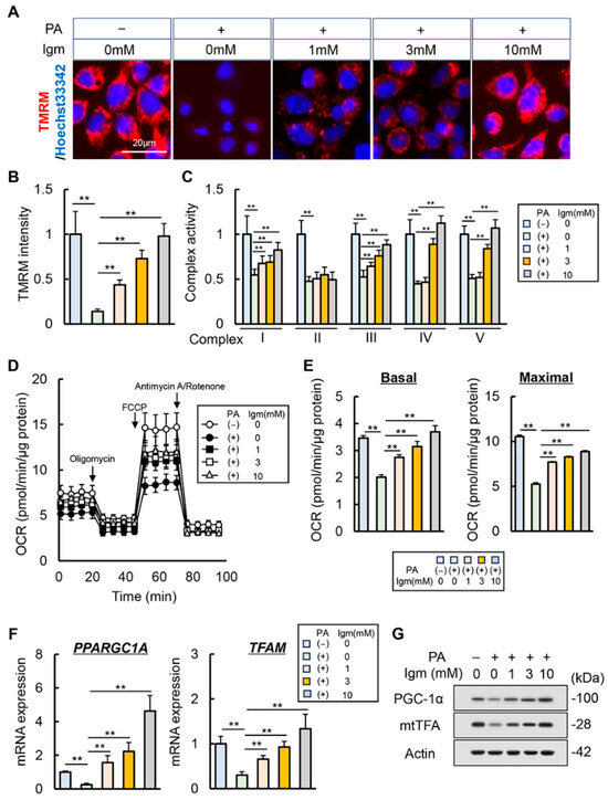Effect of imeglimin on mitochondrial dysfunction in palmitic acid-stimulated human hepatocyte. (A) Representative images of TMRM live stains corresponding to mitochondrial membrane potential in palmitic acid (PA)-stimulated HepG2. (B) Quantification of TMRM intensity per cell; data shown as the mean ± SD for 50 cells per condition in three representative experiments. Nuclei were stained with Hoechst 33342. **: p < 0.01, significant difference between groups by Student’s t-test. (C) Relative activity of mitochondrial respiratory chain complex I–V in PA-stimulated HepG2. **: p < 0.01, significant difference between groups by Student’s t-test. (D) Measurements of oxygen consumption rate (OCR) using a seahorse extracellular flux analyzer. (E) Calculations of the basal and maximal respiration rates. **: p < 0.01, significant difference between groups by Student’s t-test. (F,G) Intracellular (F) mRNA and (G) protein expression of mitochondrial biogenesis markers in PA-stimulated HepG2. **: p < 0.01, significant difference between groups by Student’s t-test. HepG2 cells were treated with 0.5 mM of PA and 0, 1, 3, 10 mM of imeglimin. Gapdh and Actin were used as an internal control for qRT-PCR and western blotting, respectively. Quantitative values are indicated as fold changes to the values of PA (−)/Igm 0 mM-treated group (B,C,F). Data are the mean ± SD (n = 8; (B–F)).