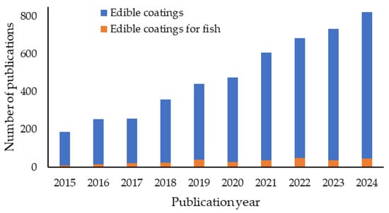 Paper publications on edible coatings or edible coatings for fish based on the Scopus database from 2015 to 2024 and the search term “edible coatings” or “edible coatings for fish”.