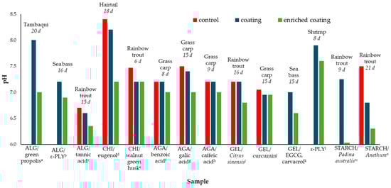 During cold storage, the pH tends to decrease within the first few days [93,94]. This was observed for Sardina pilchardus [95], Ctenopharyngodon idella [96,97,98], Dicentrarchus labrax [99], Litopenaeus setiferus [100], Oncorhynchus mykiss [101,102,103,104], and Sparus aurata [105,106]. The improper storage usually leads to autolysis, which causes tissue softening, belly bursting, and the production of hypoxanthine and lactic acid produced by muscle glycolysis in postmortem fish that change the pH. Since fish are extremely sensitive to microbial proliferation, in the later storage stages, due to microbial activity, the pH might increase. This increase is attributed to the accumulation of nitrogenous compounds, such as ammonia, amino acids, trimethylamine, hydrogen sulfide, indole, and other volatile bases, caused by the growth of microbial and endogenous enzymes [107]. Edible coatings may have a crucial role in protecting against substrate decomposition and the growth of microorganisms, causing a nearly constant pH behavior during storage [108]. Since the addition of antioxidants further improves microbial stability, it is to be expected that formulations with antioxidants would contribute even more to the pH stability (Figure 3). Song et al. (2023) [109] showed that there was a strong influence of antioxidants and correlation between the values of DPPH⋅ scavenging activity and ABTS+ scavenging and pH. As the antioxidant activity of gelatin enriched with epigallocatechin gallate increased, the pH decreased. Therefore, for samples with DPPH values of 1.2, 36.90, and 92.60%, pH decreased from 6.81 to 6.72 and 6.68, respectively. However, the presence of excessive hydrophobic additives reduced the compactness of the coatings, which weakened the water barrier properties of the coatings and caused greater weight loss, as was shown for gelatin coatings enriched with curcumin/βcyclodextrin [110].