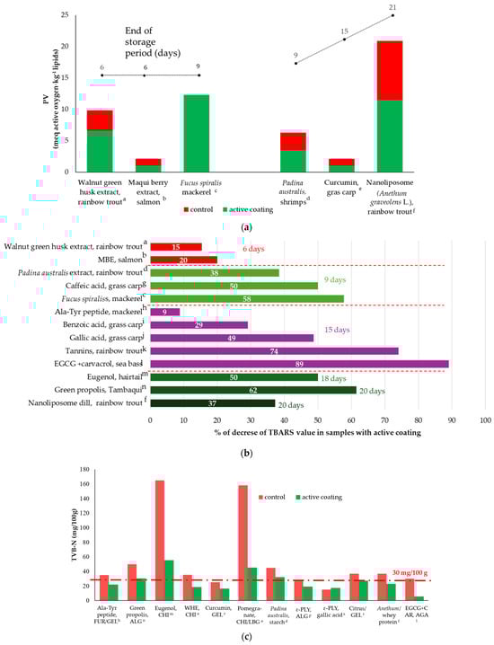 Evolution of (a) peroxide value (PV) and (b) reduction percentage in TBARS (Thiobarbituric acid reactive substances) and (c) TVB-N (Total volatile basic nitrogen) values in some fish samples with active antioxidant coatings during cold storage. [94]—a; [101]—k; [102]—d; [103]—j; [104]—i; [109]—l; [110]—e,r; [111]—n; [112]—p; [113]—m; [114]—g; [115]—t; [116]—f, [118]—b; [119]—c; [120]—h; [121]—o; [122]—s.