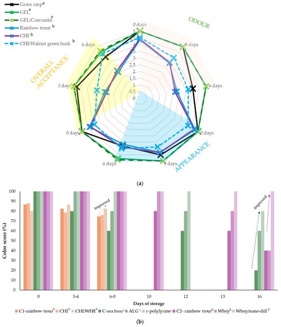 What makes a difference is that in cold storage, edible layers can form a compact film on the surface of the fish, which can effectively prevent the entry of outside air, especially oxygen. For this reason, the synergistic action with antioxidants is more than evident and described indirectly through lower peroxide, TVB-N, and TBARS values (Figure 4).