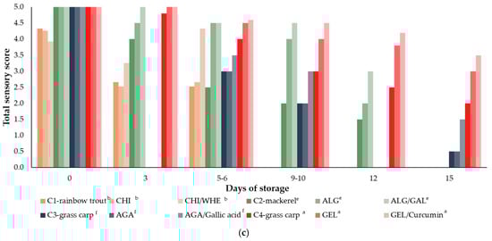 Changes in some sensory parameters and total sensory score in different fish samples as influenced by edible coatings and antioxidant compounds: (a) grass carp and rainbow trout in gelatin/curcumin and chitosan/walnut green husk-based coatings, respectively, for 6 days of storage. (b) color score (recalculated from the original data as score/max score) and (c) total sensory score (data adapted from b [94]; f [103] a [110]; c [112]; d [116]; e [117]). C1, C2, C3, and C4—control samples from each study.