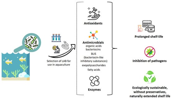LAB produce numerous metabolites, such as acids, bacteriocins, hydrogen peroxide, diacetyl, acetaldehyde, and acetoin, that exert antimicrobial activity toward pathogenic microorganisms. Therefore, LAB have a protective role and can be used as a preservative in different kinds of food, including aquaculture products, and extend the shelf life naturally without adding chemical agents [136,137].