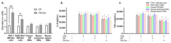 As shown, in the presence of LPS, a three-fold lower concentration of Ole-Oxy was required to reduce the viability of LPS-stimulated macrophage-like THP-1 cells (p < 0.01), and a two-fold lower concentration to inhibit RAW 264.7 macrophages (p < 0.05), suggesting the cytoprotective activity of the analog. The corresponding ratio of OP was less prominent. Similarly, Ole-Oxy reduced the inflammatory responses in hPB macrophages and in mSM and mPM, when compared to OP, but to a lesser, statistically non-significant extent (Figure 2A). The supernatants of the aforementioned cell cultures contained less IL-6 and TNF-α when Ole-Oxy was used compared to OP (p < 0.05), further supporting the anti-inflammatory activity of Ole-Oxy (Figure 2B,C).
