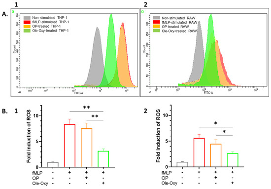 The antioxidant activity of Ole-Oxy was tested against human THP-1 and mouse RAW 264.7 cells incubated with the bacterial tripeptide fMLP (5 µM; 4 h), and further stained with CM-H2DCFDA which diffuses passively into cells, followed by esterase-cleavage and oxidization by ROS, generating a fluorescent product. In the presence of Ole-Oxy, ROS production was markedly reduced compared to cells incubated with OP (Figure 3A). Comparing the mean fluorescence intensity (MFI) values of the dye in the different conditions, a statistically significant two-fold reduction in ROS was observed in THP-1 cells incubated with Ole-Oxy compared to control and OP-treated cells (p < 0.01; Figure 3B1), with a similar reduction (two-fold) seen for RAW 264.7 cells (p < 0.05; Figure 3B2).