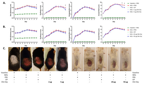 Effect of Ole-Oxy and oleuropein (OP) in imiquimod (IMQ)-induced skin inflammatory lesions in vivo. IMQ was applied daily for 6 consecutive days (−6 to −1) on the skin of (A) C57BL/6J and (B) BALB/c mice to induce a local inflammatory response. OP or Ole-Oxy were administered once daily intraperitoneally (i.p.) for 4 consecutive days (0 to +3). Control mice received PBS. Epidermal thickness (1st column) recorded using a digital caliper, erythema and skin desquamation (2nd and 3rd columns) were evaluated daily. The cumulative score (PASI) is presented in the last column. Pooled data from n = 4 mice/group are shown. (C) Representative photographs of C57BL/6J (left) and BALB/c mice (right) showing the extent of inflammation on day +3. *, p < 0.05, when comparing the 5 μg Ole-Oxy-treated group with the OP-treated group.