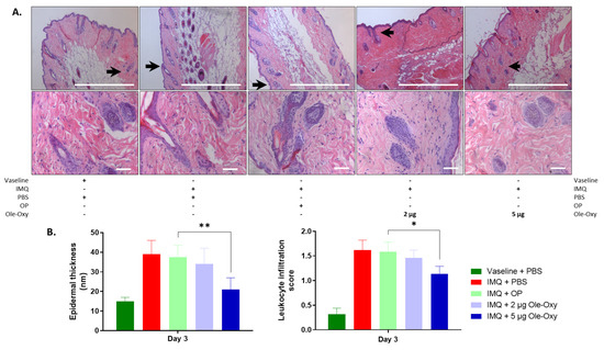 Histologically, a variation of a semi-quantitative scoring system was used [31] (Table S2). Leukocyte infiltration and epidermal thickness were assessed across five fields of inflamed tissue per slide in C57BL/6J and BALB/c mice. At 10× magnification, modifications in the tissue architecture were depicted in all IMQ-administered groups in both animal strains, verifying the setting of inflammation. Specifically, in C57BL/6J mice (Figure 5A), epidermal thickness decreased statistically significantly in the group that received 5 μg/dose of Ole-Oxy, when compared with the OP-treated group. At 40× magnification, a statistically significant decrease in leukocyte infiltration at the same dosage was observed (Figure 5B). The lower Ole-Oxy dose (2 μg/dose) did not show any statistically significant differences in the criteria used when compared with the OP-treated group. In BALB/c mice, neither epidermal thickness nor leukocyte infiltration revealed any statistically significant differences between the Ole-Oxy- and OP-treated groups (Figure S3).