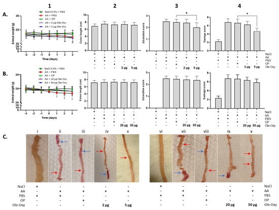 Effect of Ole-Oxy and oleuropein (OP) administration in acetic acid (AA)-induced colon inflammation in vivo. AA was administered intrarectally on day 0 to induce local inflammation in C57BL/6J (A) and BALB/c mice (B), after a 3-day fasting period. Ole-Oxy and OP were administered i.p. once daily for 4 consecutive days (0 to 3). Control mice received PBS. Animal weight (1) was recorded daily. The length of the colon (2), ulceration (3) and damage (4) scores were recorded postmortem (day 3). Pooled data from n = 4 mice/group are shown. (C) Representative pictures of colon preparations from both C57BL/6J (left; i–v) and BALB/c mice (right; vi–x) are shown. Red arrow—linear ulcer without significant inflammation; blue arrow—linear ulcer with inflammation at one focus. *, p < 0.05, compared with the OP-treated group.