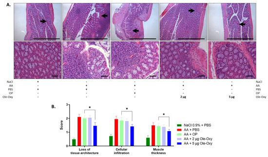 Effect of Ole-Oxy and OP on AA-induced colon inflammatory lesions in C57BL/6J mice. (A) Representative photographs of H/E-stained histological sections of inflamed tissue at 10× (top) and 40× (bottom) magnification. Scale bar, 100 μm. Arrows in 10× show areas enlarged at 40× magnification. (B) Bar chart summarizing the histopathological scores of the loss of tissue architecture, leukocyte infiltration and muscle thickness based on pooled data from n = 4 mice/group. *, p < 0.05, compared with the OP-treated group.