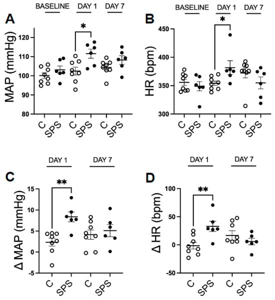 The rats were randomly divided into two groups: one group received SPS treatment, while the other served as the control. Baseline MAP (Control: 100.1 ± 1.5 vs. SPS: 103.1 ± 2.0 mmHg) and HR (Control: 355.6 ± 5.5 vs. SPS: 348.9 ± 8.2 beats/min) were measured prior to treatment using a telemetry system. To evaluate the acute and longer-term effects of SPS on BP and cardiovascular function, MAP and HR were measured 5–6 h post-exposure on day 1, and again 7 days after the sensitization period. The results (Figure 1A,B) showed that on day 1, SPS rats exhibited a significant acute increase (p < 0.05) in both MAP (Control: 102.5 ± 2.0 vs. SPS: 111.5 ± 2.4 mmHg) and HR (Control: 354.1 ± 4.0 vs. SPS: 381.8 ± 12.1 beats/min) compared to control rats. However, by day 7, the cardiovascular responses were no longer significantly different between the SPS and control groups (MAP: Control: 104.4 ± 1.4 vs. SPS: 108.2 ± 2.3 mmHg; HR: Control: 372.4 ± 8.6 vs. SPS: 354.9 ± 10.5 beats/min), indicating that the initial cardiovascular effects of SPS were transient.