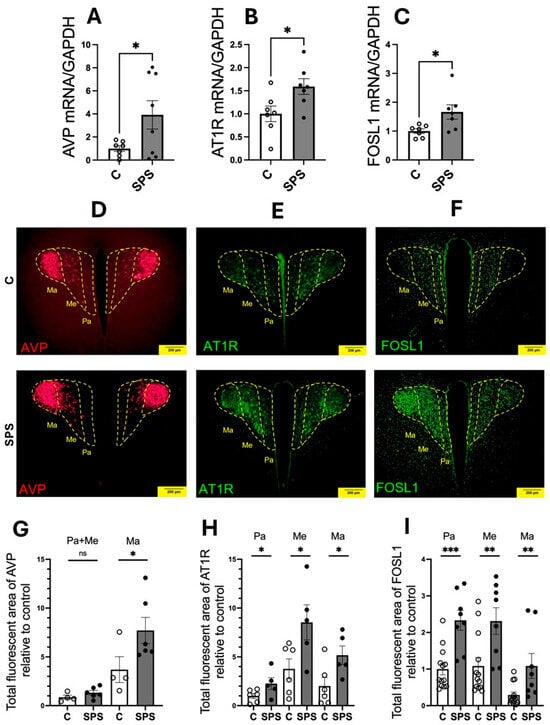 To assess the impact of SPS on the expression of genes involved in cardiovascular regulation within the PVN, mRNA levels of AVP, AT1R, and FOSL1 were measured in the PVN of SPS-exposed and control rats on day 7 post-treatment. The results demonstrated a significant upregulation of AVP (3.9-fold), AT1R (1.6-fold), and FOSL1 (1.6-fold) mRNA levels in SPS rats compared to controls (p < 0.05; Figure 2A–C). Immunofluorescence analysis further confirmed increased protein levels of AVP, AT1R, and FOSL1 in the PVN of SPS-exposed rats, indicating enhanced expression at both the mRNA and protein levels (Figure 2D–I).