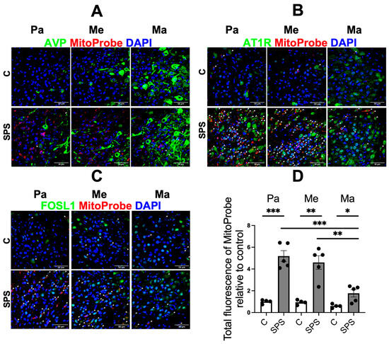 Our data further indicated that SPS induced mtROS particularly in the Pa and Me regions (Figure 3). The colocalization of mtROS with AT1R- and FOSL1-expressing cells suggests that oxidative stress may play a critical role in amplifying sympathetic outflow and stress responses. This supports the notion that AT1R signaling can drive oxidative stress, which in turn enhances neuronal excitation and sympathetic nerve activity [43,44,45]. The preferential localization of mtROS in autonomic subregions may point to the selective vulnerability of sympathetic pathways to oxidative stress, which needs to be further investigated.