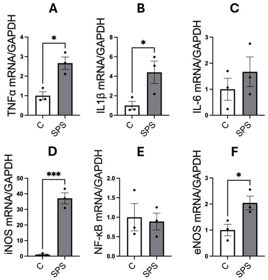SPS increases mRNA expression of pro-inflammatory cytokines and nitric oxide synthases in the aorta of male SD rats. The mRNA levels of TNFα (A), IL-1β (B), IL-6 (C), iNOS (D), NF-κB (E), and eNOS (F) were measured in the aorta of male SD rats with and without SPS exposure. Gene expression was quantified using real-time PCR, with mRNA levels normalized to GAPDH. Statistical analysis was performed using a two-way unpaired Student’s t-test. Each data point represents an individual rat (n = 3 per group). Data are presented as mean ± SEM. Statistical significance is indicated as follows: * p < 0.05, *** p < 0.001.
