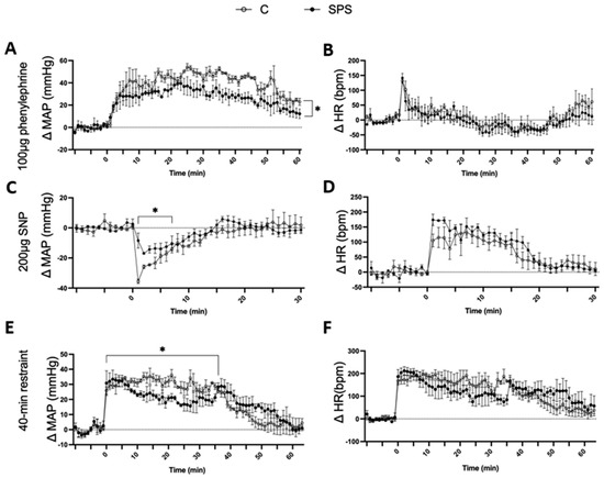 The effects of repeated restraint stress on cardiovascular response were also assessed. During the 40 min restraint, SPS rats had a significantly lower ΔMAP (23 ± 0.9 mmHg) compared to controls (30.59 ± 0.5 mmHg, p < 0.05; Figure 5E), even though both groups showed an increase in ΔMAP from their baseline levels. After restraint, the MAP of SPS rats remained elevated and returned to baseline levels more slowly than controls (SPS: 15.32 ± 1.6 mmHg vs. Control: 9.2 ± 1.5 mmHg, p < 0.05). The HR response remained similar across both groups throughout the restraint period (Figure 5F).