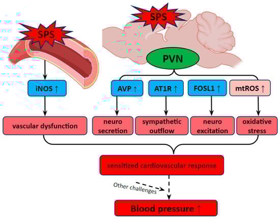 The present study aimed to investigate the effects of SPS on cardiovascular responses and vascular function, with a focus on elucidating the mechanisms through which stress contributes to hypertension. Our major findings indicate that SPS elicits acute but not sustained changes in BP and HR, elevates hypertension-associated genes’ expressions and mtROS levels in the PVN, and increases vascular inflammatory cytokines as well as impaired vascular reactivity. These results suggest that traumatic stress may contribute to the progression of hypertension through persistent dysregulation of the PVN and vascular system.