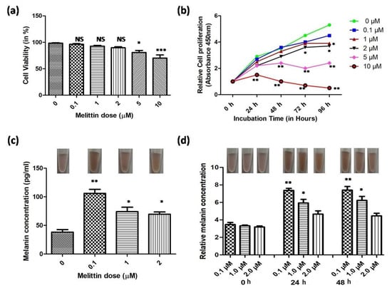 Effect of melittin (dose- and time-dependent) on cell viability, cell proliferation, and melanin content of cultured human melanocytes. (a) Cell viability in percentage at different concentrations of melittin (0.1 µM, 1 µM, 2 µM, 5 µM, and 10 µM) after 24 h; (b) relative cell proliferation at different concentrations of melittin (0.1 µM, 1 µM, 2 µM, 5 µM, and 10 µM) and at different time points (0 h, 24 h, 48 h, 72 h, 96 h); (c) melanin content (pg/mL) in melittin- (0.1 µM, 1 µM, 2 µM) treated melanocytes (24 h) (upper panel shows the representative melanocyte cell pellets in suspension); (d) relative melanin content of cultured melanocytes treated with different concentrations of melittin at different time points (* p < 0.01; ** p < 0.001; *** p < 0.0001; NS = not significant).