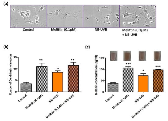 Therefore, alternative treatment strategies that may lead to repigmentation in the vitiligo lesional skin are highly warranted. With this aim, we identified melittin, which is a major active ingredient of the bee venom produced by all species of honeybees. Melittin is a twenty-six-amino-acid-long peptide, and it possesses anti-inflammatory, anti-tumor, anti-microbial, and anti-parasitic properties along with antioxidant properties [10,11,12,13]. The role of melittin in regulating melanin synthesis by melanocytes has not been investigated yet. In the present study, we investigated the effect of melittin on melanin production in the presence or absence of NB-UVB in cultured human melanocytes, followed by determining the expression of the key factors involved in melanogenesis and melanin transfer along with the status of oxidative stress in melanocytes.