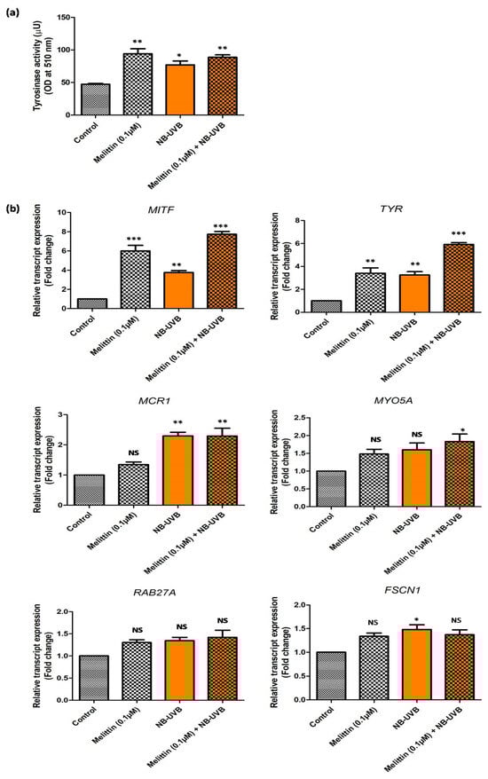 Effect of melittin and NB-UVB on (a) tyrosinase activity of melanocytes; (b) transcript (mRNA) expression of genes associated with melanin synthesis and melanin transfer in cultured human melanocytes treated with melittin (0.1 µM), NB-UVB (0.28 Jcm−2), and combination (melittin + NB-UVB) after 48 h of culture. (* p < 0.01; ** p < 0.001; *** p < 0.0001; NS = not significant).