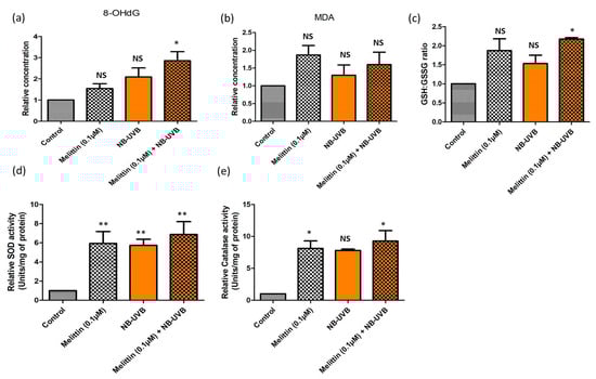 Effect of melittin and NB-UVB on oxidative stress-associated markers: (a) 8-hydroxy-2’-deoxyguanosine (8-OHdG); (b) malondialdehyde (MDA); (c) ratio of total glutathione (GSH+GSSG)/reduced glutathione (GSH); (d) catalase activity; (e) superoxide dismutase (SOD) activity, of cultured human melanocytes treated with melittin (0.1 µM), NB-UVB (0.28 Jcm−2), and combination (melittin + NB-UVB) after 48 h of culture. (* p < 0.01; ** p < 0.001; NS = not significant).