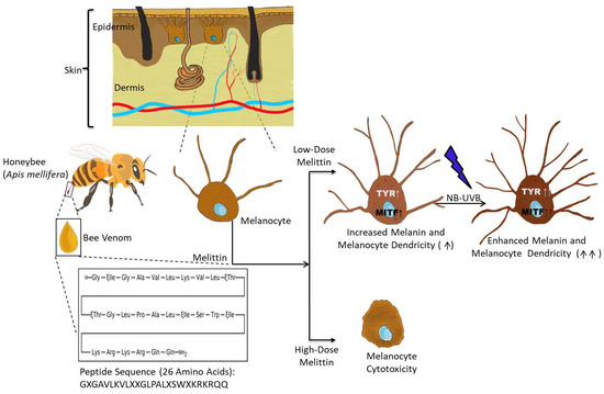 Schematic representation of the mechanism of action of low-dose melittin (LDM) (active ingredient of bee venom produced by honeybees) and NB-UVB in enhancing the melanin synthesis (by upregulating the activity of rate-limiting enzyme tyrosinase (TYR), transcription factor MITF, and total melanin content) and melanocyte dendricity. The high dose of melittin leading to melanocyte cytoxicity may be contributed by the lytic properties of melittin and/or enhanced oxidative stress (note: the upward arrow indicates the increased expression, and the number of arrows indicates the magnitude of the increase).
