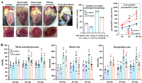 Effects of dietary 25-hydroxycholecalciferol (25-OH-D3) supplementation on cardiac hypertrophy, blood pressure, and cardiorespiratory function of broiler breeder hens provided with restricted (R) or ad libitum (Ad) feed intake. Hens at age of 28, 33, and 45 weeks (n = 4, 7, and 7 from each group, respectively) were necropsied for cardiac remodeling analysis (A). Before necropsy, blood pressure, and heart and respiration rates were measured (B). Pathological remodeling was judged by concentric hypertrophy, dilation, and pericardial effusion, and results are expressed as an incidence (total n = 18 for each group). *; significant difference by Ad-feed intake (vs. corresponding R-hens, p < 0.05). +; significant difference by 25-OH-D3 (vs. R- or Ad-hens, p < 0.05).