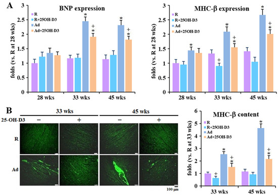 Consistent with relieved cardiorespiratory responses, 25-OH-D3 supplementation significantly ameliorated cardiac fibrosis and inflammation (p < 0.05, Figure S4A,B), and attenuated heart failure marker BNP and MHC-β upregulations at 33 and 45 weeks in Ad-hens, and even downregulated MHC-β expressions at 33 weeks in R-hens (p < 0.05, Figure 2A,B).