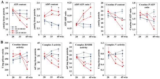 Effects of dietary 25-hydroxycholecalciferol (25-OH-D3) supplementation on cardiac energy status and ETC complex activity of broiler breeder hens provided with restricted (R) or ad libitum (Ad) feed intake. Hearts collected at 28, 33, and 45 weeks were used for ATP and ADP content, CrK (creatine kinase) activity, creatine phosphate (creatine-P) concentration (A) determination, and for mitochondrial electron transport chain (ETC) complex I, II, and V activity (B) analysis (n = 4) *; significant difference by Ad-feed intake (vs. corresponding R-hens, p < 0.05) +; significant difference by 25-OH-D3 (vs. R- or Ad-hens, p < 0.05).