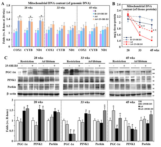 Effects of dietary 25-hydroxycholecalciferol (25-OH-D3) supplementation on cardiac mitochondrial biogenesis and dynamics of broiler breeder hens provided with restricted (R) or ad libitum (Ad) feed intake. Hearts collected at 28, 33, and 45 weeks were used for relative mitochondrial DNA quantification using total DNA extracts for qRT-PCR with specific primers targeted to mitochondrial (COX1, CYTB, and ND1) and nuclear (GAPDH) genes (A). Mitochondrial fractions were used for actual DNA content determination using a fluorescence dye method (B). Activation of PGC-1α (PPAR-γ coactivator 1-alpha), PINK1 (PTEN-induced kinase 1), and Parkin expressions for mitophagy were analyzed by Western blotting with nuclear extracts and total cell lysates, respectively (C). Results of qRT-PCR and Western blot were normalized to GADPH and β-actin, respectively, and expressed as ratios relative R-hens at 28, 33, or 45 weeks (n = 4) *; significant difference by Ad-feed intake (vs. corresponding R-hens, p < 0.05) +; significant difference by 25-OH-D3 (vs. R- or Ad-hens, p < 0.05). ND1; NADH ubiquinone oxidoreductase chain 1, CYTB; cytochrome b, COX1; cytochrome oxidase 1, GADPH; glyceraldehyde-3-phosphate dehydrogenase.