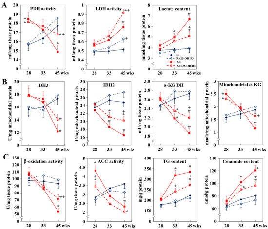 Effects of dietary 25-hydroxycholecalciferol (25-OH-D3) supplementation on cardiac metabolic remodeling of broiler breeder hens provided with restricted (R) or ad libitum (Ad) feed intake. Hearts collected at 28, 33, and 45 weeks were used for PDH (pyruvate dehydrogenase) and LDH (lactate dehydrogenase) activity, lactate concentration (A), IDH2 (isocitrate dehydrogenase 2), IDH3, and α-KGDH (α-ketoglutarate dehydrogenase) activity, α-KG concentration (B), β-oxidation, ACC activity, TG (triacylglycerol), and ceramide content analysis (C) (n = 4) *; significant difference by Ad-feed intake (vs. corresponding R-hens, p < 0.05) +; significant difference by 25-OH-D3 (vs. R- or Ad-hens, p < 0.05).