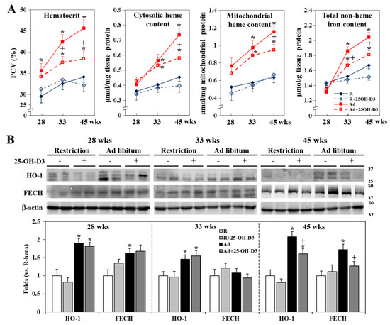 Effects of dietary 25-hydroxycholecalciferol (25-OH-D3) supplementation on hematocrit and cardiac heme metabolism of broiler breeder hens provided with restricted (R) or ad libitum (Ad) feed intake. Blood samples collected at 28, 33, and 45 weeks (n = 4, 7, and 7 from each group) were used for hematocrit analysis and, after necropsy, hearts were used for cytosolic and mitochondrial heme and iron content analysis (n = 4) (A). HO-1 (heme oxygenase-1) and FECH (ferrochelatase) expressions were analyzed by Western blotting (B). Results of Western blot are normalized to β-actin and expressed as ratios relative to R-hens at 28, 33, or 45 weeks (n = 4) *; significant difference by Ad-feed intake (vs. corresponding R-hens, p < 0.05) +; significant difference by 25-OH-D3 (vs. R- or Ad-hens, p < 0.05).