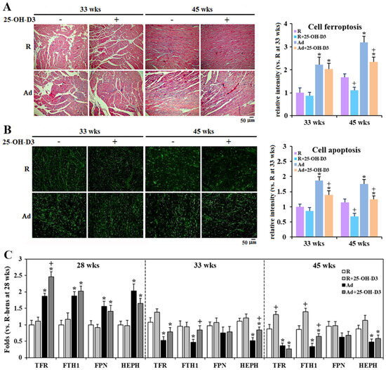 Consistent with redox dysregulations and cellular heme and iron accumulation (Figure 7 and Figure 8), Ad-hens showed very pronounced cardiac cell ferroptosis and apoptosis as indicated by Prussian staining and TUNEL assay, respectively (p < 0.05, Figure 8A,B) [18,28]. Cardiac iron uptake and disposal in Ad-hens was programmed with compensatory upregulation of related gene expressions, including TFR (Transferrin receptor), FTH1 (Ferritin, heavy chain 1), FPN (Ferroportin-1), and HEPH (Hephaestin) at 28 weeks, but progressed with downregulation of TFR, FTH1, and HEPH at 33 and 45 weeks, leading to labile iron accumulation and, eventually, ferroptotic cell death (p < 0.05, Figure 7A and Figure 8C). Supplemental 25-OH-D3 significantly relieved cardiac cell death in both Ad- and R-hens at 33 and/or 45 weeks consistently with rescued or potentiated TFR, FTH1, and HEPH expressions (p < 0.05, Figure 8A–C).