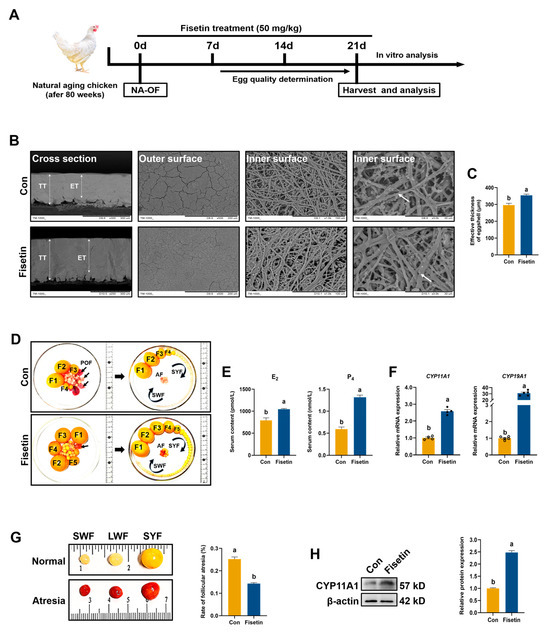 Effect of fisetin on follicle development, egg quality, and hormone balance in NA-OF model. (A) Experimental design of fisetin treatment and analysis in NA-OF model. (B) Scanning electron microscope (SEM) images of eggshells, displaying cross-sections, outer surfaces, and inner surfaces. TT: Total thickness; ET: effective thickness. White arrows indicate calcareous fibers. (C) Eggshell effective thickness (n = 6). (D) Ovaries of aged laying chickens (580-day-old). Avian ovarian follicles are generally categorized by size or color: large preovulatory follicles (F1, F2, F3, etc.), small yellow follicle (SYF), large white follicle (LWF), and small white follicle (SWF). Black arrow: post-ovulation follicle; AF: atretic follicle. (E) Levels of serum estrogen (E2) and progesterone (P4) (n = 15). (F) Relative mRNA expression of steroid synthesis-related genes (CYP11A1, CYP19A1) in SWF. (G) Images and rate of atretic follicles (n = 6). (H) Western blot and quantitative analysis of CYP11A1 expression in SWF (n = 3). Values are shown as mean ± SEM. Different letters represent statistically significant differences among the groups (p < 0.05).