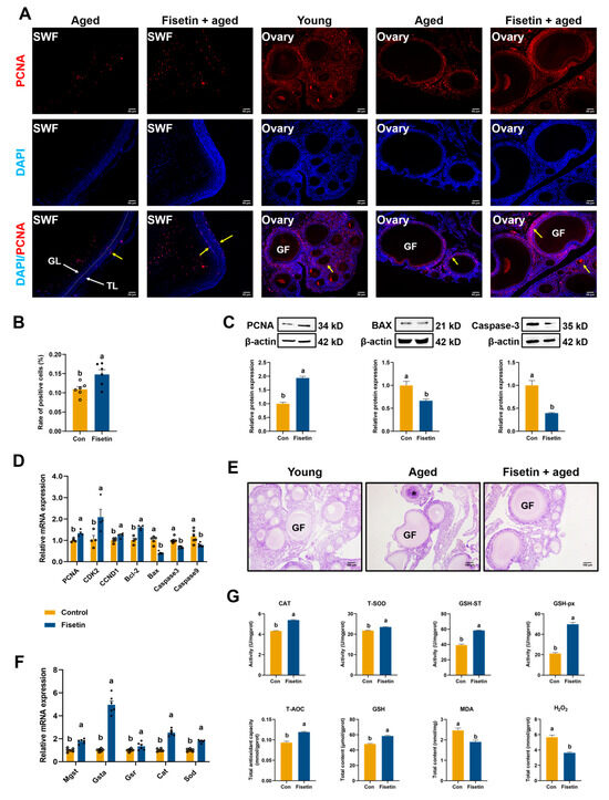 Effect of fisetin on proliferation and antioxidant enzymes in NA-OF model. (A) Typical images of PCNA expression (TRITC, red) in the ovary and SWF from young (280-day-old) and aged (580-day-old) laying chickens. TL: theca layer; GL: granulosa layer; GF: growing follicle. Yellow arrow: PCNA-positive cell. Nuclei were stained blue with DAPI. Scale bars: 50 μm and 100 μm. (B) PCNA positivity rate of SWF from aged laying chickens (n = 6). The proliferative level was determined by the PCNA positivity rate. (C) Western blotting showing the expression of PCNA, BAX, and Caspase-3 in SWF (n = 3). (D) The mRNA expression levels of cell cycle-related genes (PCNA, CCND1, CDK2, Bcl-2, Bax, Caspase 3, and Caspase 9) in SWF. (E) H&E staining ovaries harvested from young and aged laying chickens. Asterisk: atretic ovarian follicle. (F) Relative mRNA expression of antioxidant-related genes (Mgst, Gsta, Gsr, Cat, and Sod) in SWF (n = 6). (G) Levels of oxidative- and antioxidant-related parameters (T-SOD, CAT, GSH-px, GSH-ST, T-AOC, GSH, MDA, and H2O2) in SWF (n = 6). Values are shown as mean ± SEM. Different letters represent statistically significant differences among the groups (p < 0.05).