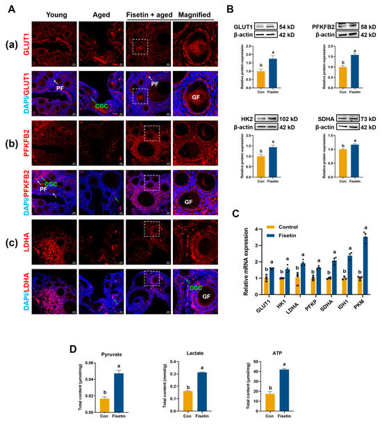 Effect of fisetin on ovarian glucose catabolism in the NA-OF model. (A) Immunofluorescence images of ovaries stained with GLUT1, PFKFB2, and LDHA antibodies (Red: positive cells; Blue: DAPI), and images in the white dotted boxes were enlarged on the right. Scale bar: 50 μm and 20 μm. Green arrow: cyst germ cell (CGC); white arrow: primordial follicle (PF); GF: growing follicle. (B) Relative protein expression of glucose metabolism-related enzymes (GLUT1, PFKFB2, HK2, SDHA) in SWF (n = 3). (C) Relative mRNA expressions of glycolysis-related genes (GLUT1, HK1, LDHA, PFKP, SDHA, IDH1, and PKM) in SWF. (D) Total contents of pyruvate, lactate, and ATP in SWF (n = 6). Values are shown as mean ± SEM. Different letters represent statistically significant differences among the groups (p < 0.05).