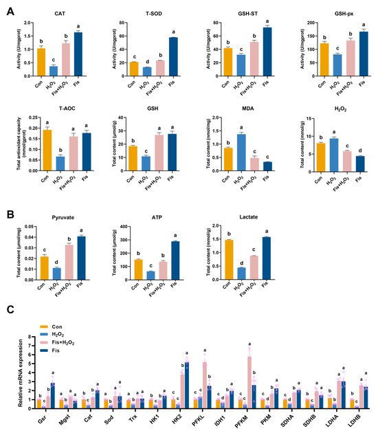 Effect of fisetin on antioxidant- and glucose metabolism-related enzymes in the HA-OF model. (A) Levels of oxidation- and antioxidant-related parameters (CAT, GSH-ST, GSH-px, T-SOD, T-AOC, GSH, MDA, and H2O2) in SWF (n = 6). (B) Levels of lactate, pyruvate, and ATP in SWF (n = 6). (C) Relative mRNA expression of antioxidant enzyme genes (Gsr, Mgst, Cat, Sod, and Trx) and glucose metabolism-related enzyme genes (HK1, HK2, PFKL, IDH1, PFKM, PKM, SDHA, SDHB, LDHA, and LDHB) in SWF (n = 4). Values are shown as mean ± SEM. Different letters represent statistically significant differences among the groups (p < 0.05).