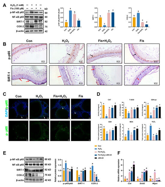 Effect of fisetin on the NF-κB signaling pathway in the HA-OF model. (A) Inhibition of NF-κB by fisetin in H2O2-induced SWF, as revealed by Western blot analysis (n = 3). Phosphorylated NF-κB p65, total NF-κB p65, SIRT-1, and COX-2 were analyzed. (B) Immunohistochemical staining for SIRT-1 and p-p65 in SWF. Black arrows indicate the localization of p-p65, primarily expressed in granulosa cells. Red arrows indicate the localization of SIRT-1, primarily expressed in theca cells. (C) Expression of p-p65 in ovaries (FITC, green). White arrows indicate the presence of phosphorylated p65 in ovarian follicles and its translocation to the nucleus. Scale bar: 20 μm. (D) Levels of oxidative and antioxidant-related parameters. (E) Western blot analysis of p-p65/p65, SIRT-1, and COX-2 in SWF (n = 3). (F) Levels of Cat, Sod2, and Mgst mRNAs in SWF (n = 3). Values are presented as mean ± SEM. Different letters represent statistically significant differences among the groups (p < 0.05).